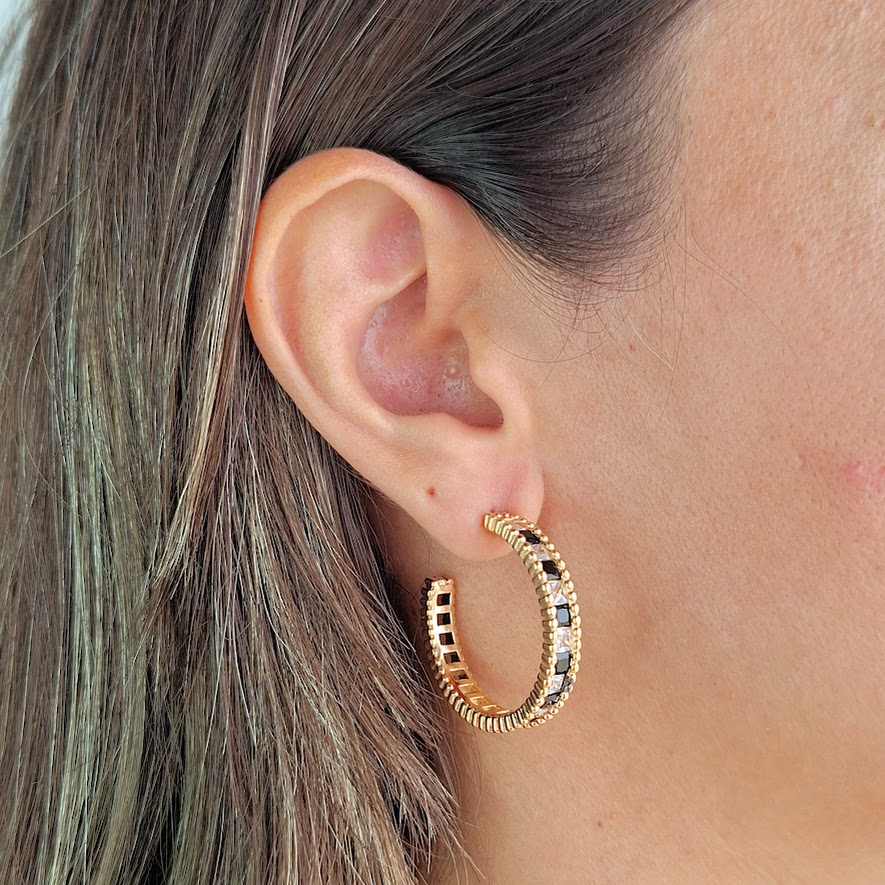 CARACTERÍSTICAS GERAIS: Argola pino mais tarraxa com base em metal banhado mais banho em verniz e detalhes centrais em zircônias brancas e pretas. Isento de metais nocivos à saúde.