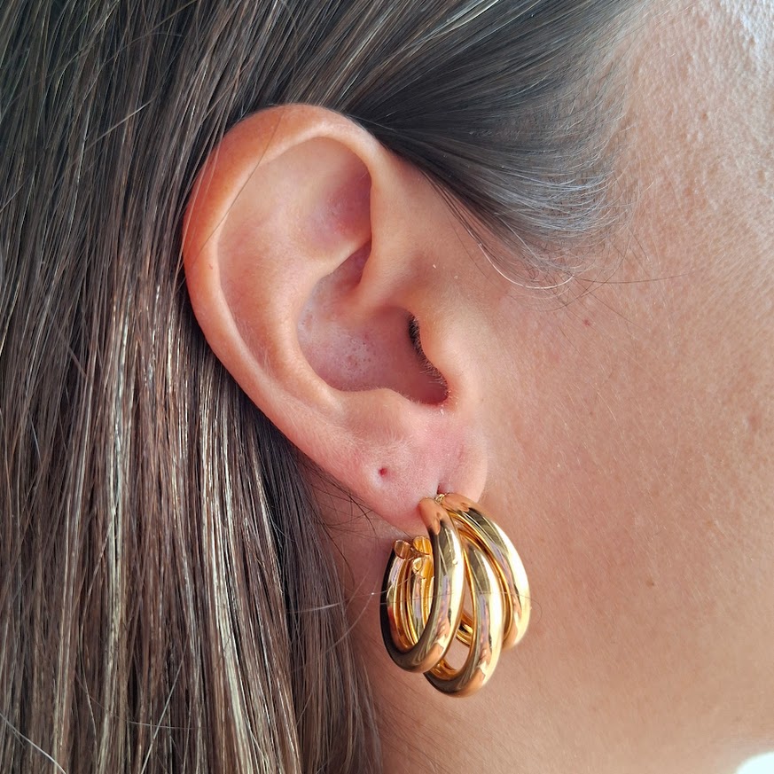 DESCRIÇÃO DO PRODUTO: Argola pino com tarraxa em alumínio banhada. Detalhes com 3 canos, compondo 3 voltas.