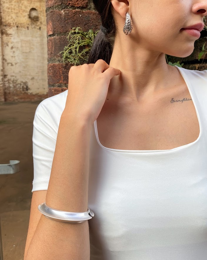 DESCRIÇÃO DO PRODUTO: Bracelete em metal banhado na cor prata com detalhes escovados.