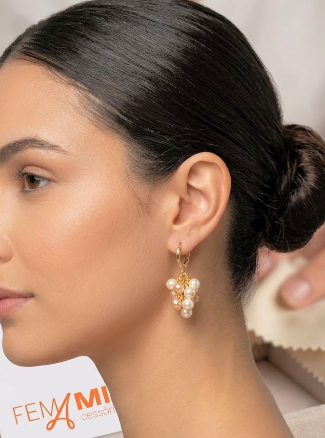 DESCRIÇÃO DO PRODUTO: Brinco com a base argola e entremeios em alumínio banhado, pérolas em material ABS e cristais em vidro.