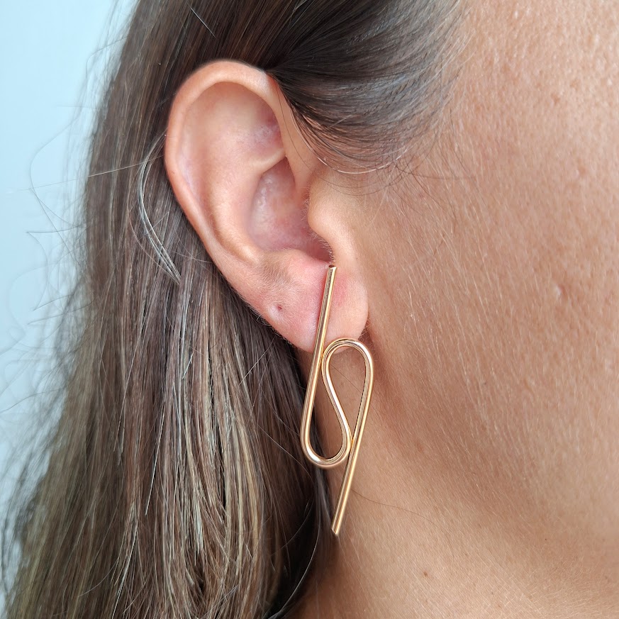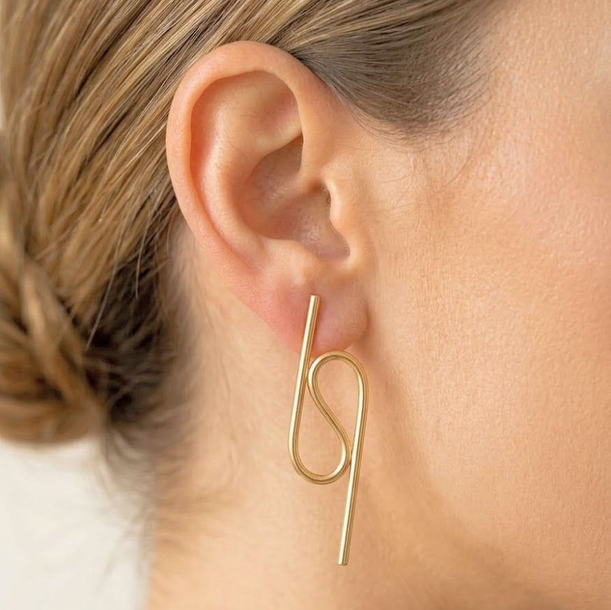DESCRIÇÃO DO PRODUTO: Brinco pino mais tarraxa em metal banhado apresentando formato contemporâneo com curvas.