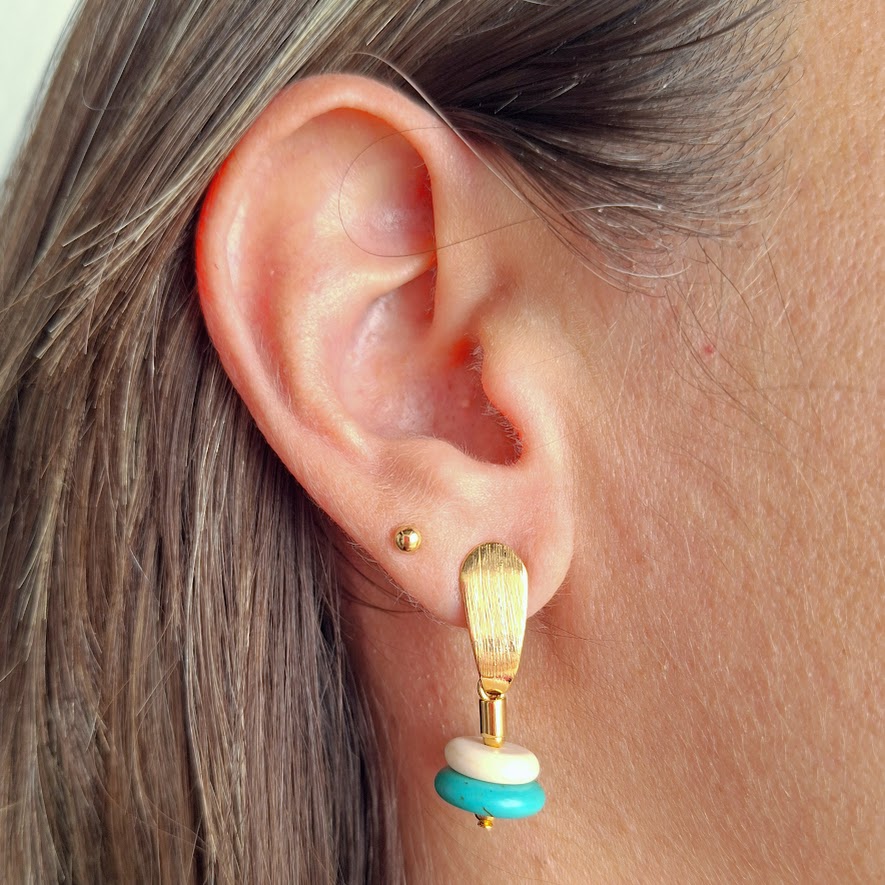 DESCRIÇÃO DO PRODUTO: Brinco pino mais tarraxa com base oval e entremeios em alumínio banhado mais discos em pedra natural howlita branca e azul.