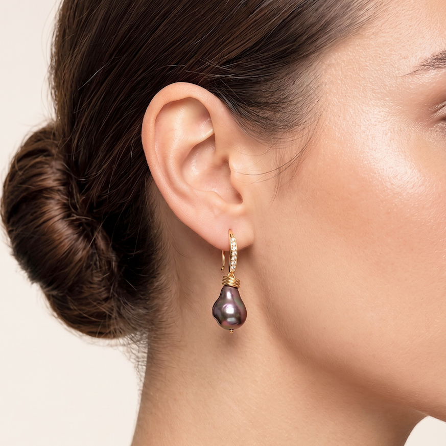 CARACTERÍSTICAS GERAIS: Base gancho em metal banhado cravejado com pontos de luz em zircônia mais pingente em pérola shell estilo boho