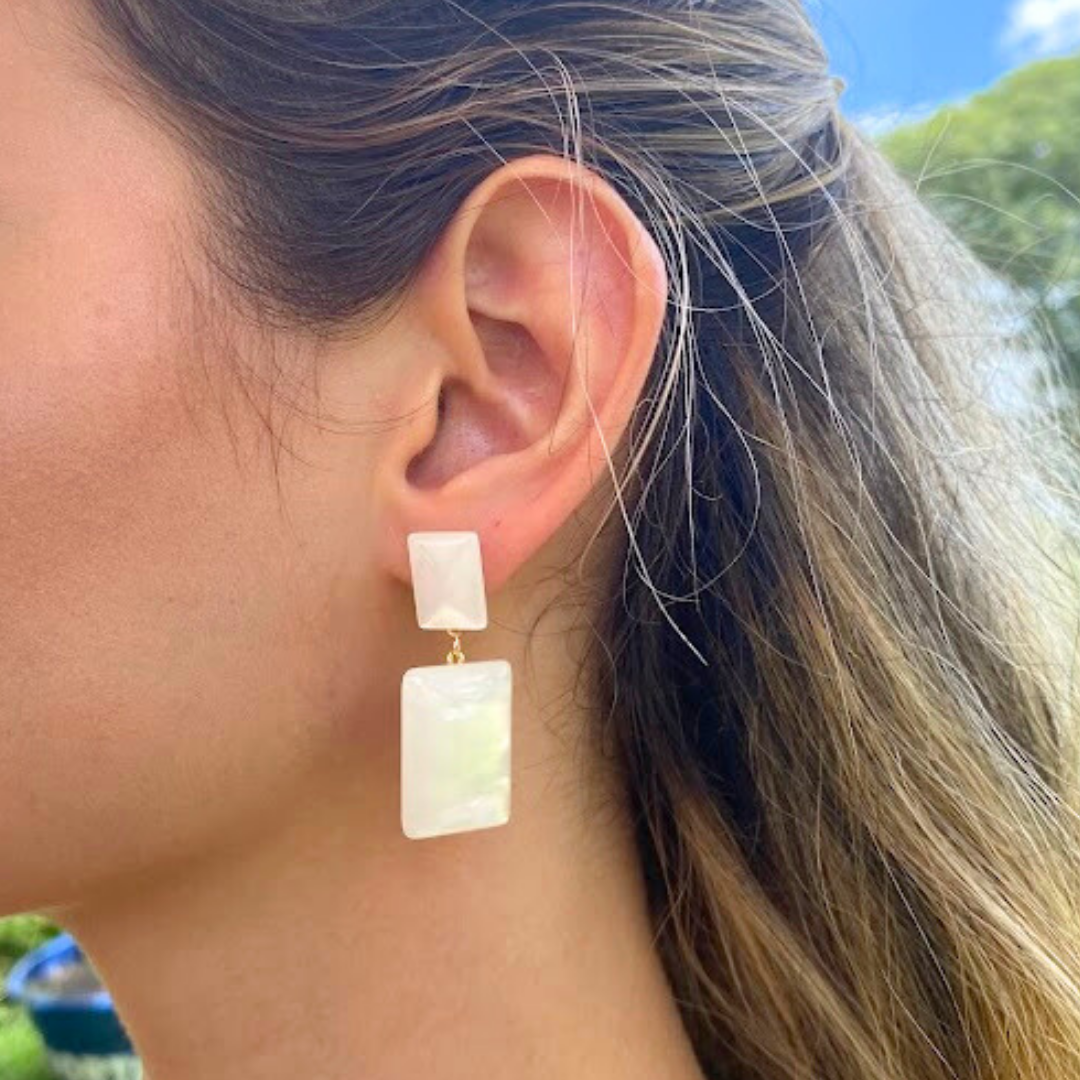 DESCRIÇÃO DO PRODUTO: Brinco pino mais tarraxa com base e pingente retangulares banhados mais detalhe em resina furta cor.