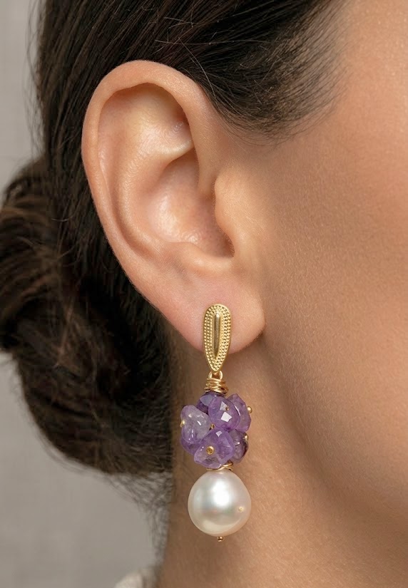 PEÇAS: metais banhados, metais em alumínio leves e resistentes, pérola shell mais cascalho em ametista.