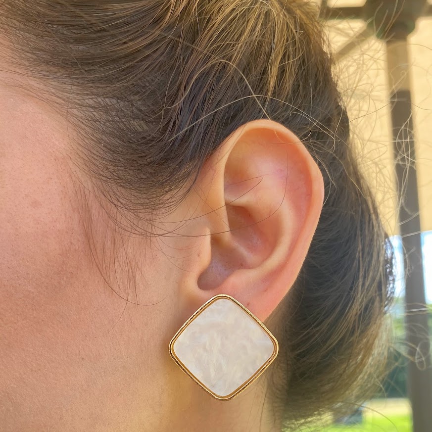 DESCRIÇÃO DO PRODUTO: Brinco pino mais tarraxa com base geométrica quadrada em metal banhado mais detalhe central em resina perolada.