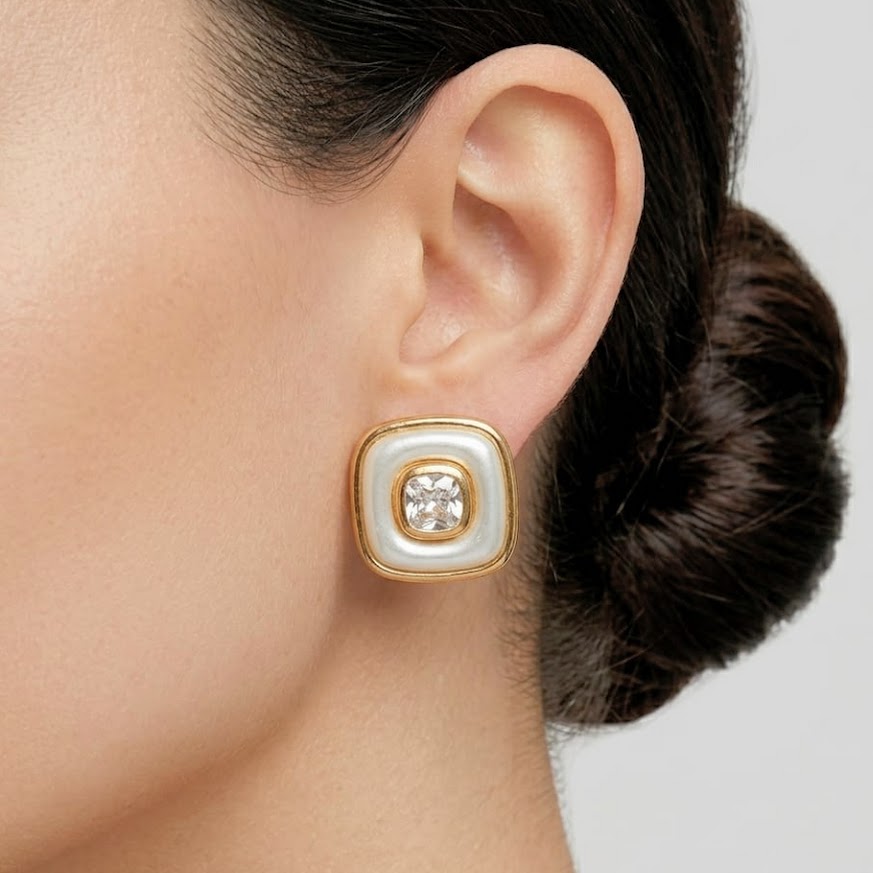 DESCRIÇÃO DO PRODUTO: Brinco pino mais tarraxa com base em alumínio banhado no formato quadrado, detalhe em resina e strass central