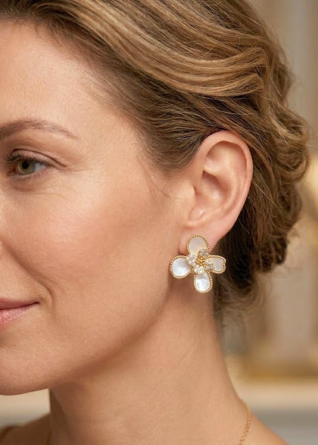 DESCRIÇÃO DO PRODUTO: Brinco pino mais tarraxa com base em alumínio banhado no formato de flor com detalhes em resina mais pontos de luz centrais em zircônia.