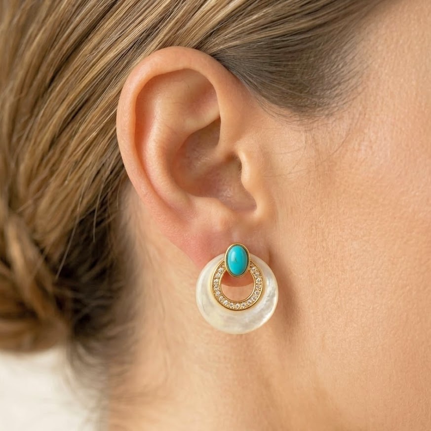 DESCRIÇÃO DO PRODUTO: Brinco pino mais tarraxa com base oval em alumínio banhado, detalhes em resina mais pontos de luz cravejados em zircônia.