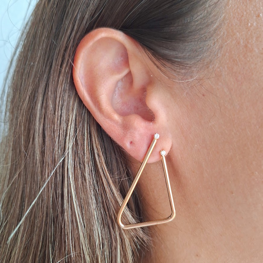 DESCRIÇÃO DO PRODUTO: Brinco pino mais tarraxa com formato triangular em metal banhado mais ponto de luz em zircônia.