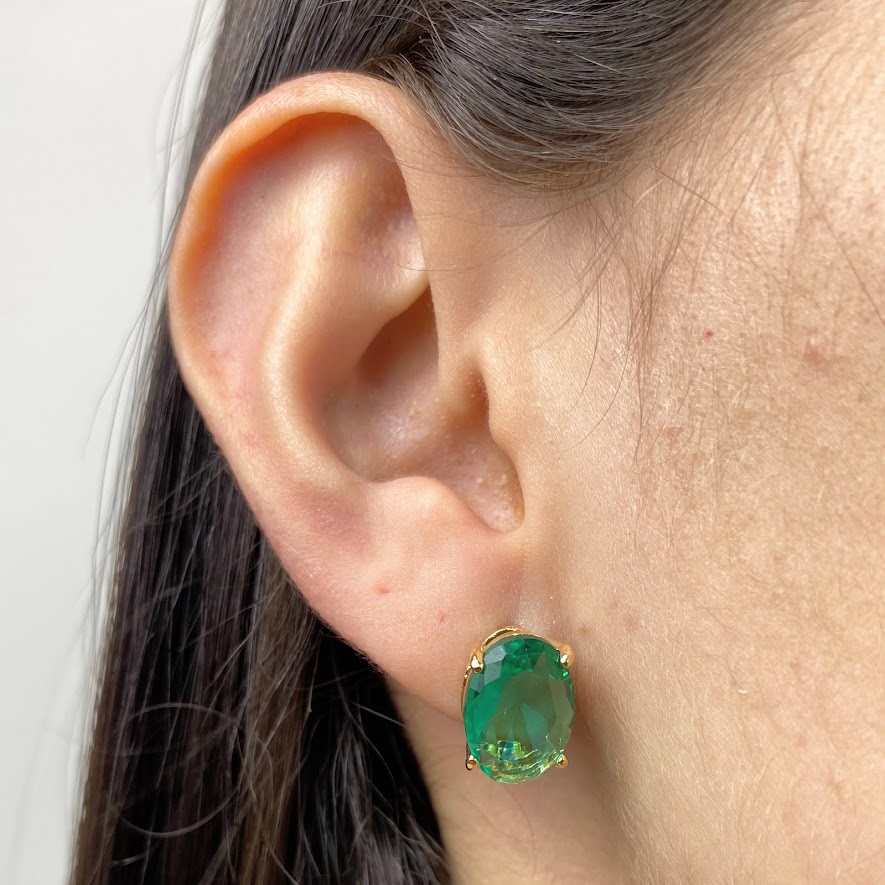 DESCRIÇÃO DO PRODUTO: Brinco pino mais tarraxa com base no formato oval em metal banhado e banhado em verniz mais detalhe central lapidado em cristal em vidro.
