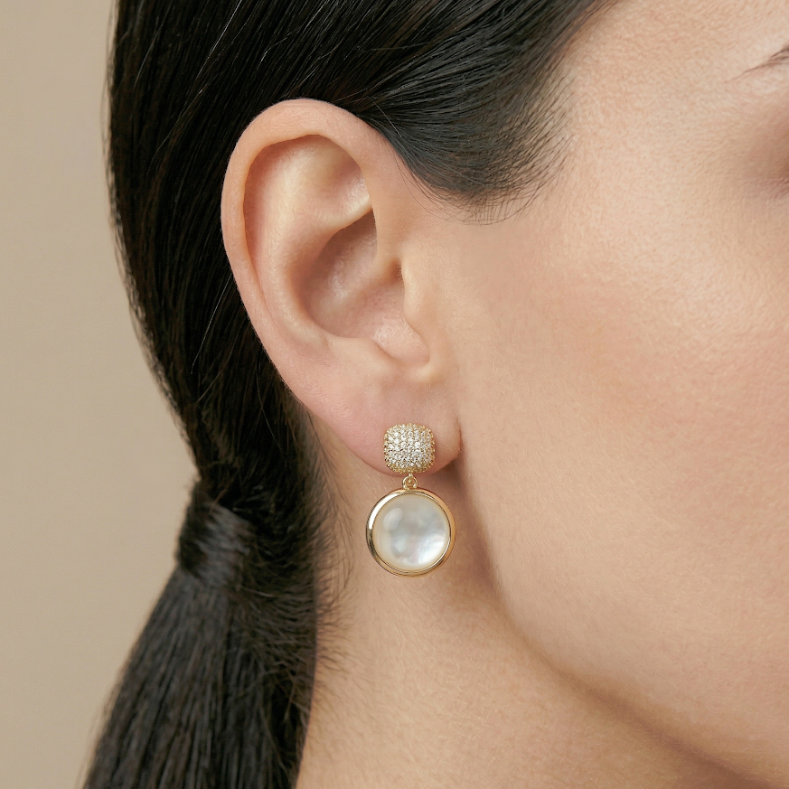 DESCRIÇÃO DO PRODUTO: Brinco pino mais tarraxa com base retangular banhada cravejada em zircônias e pingente circular banhado com detalhe central em pedra olho de gato.