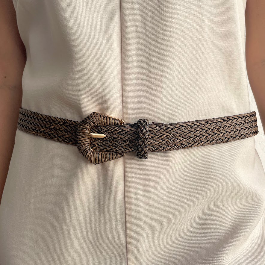 DESCRIÇÃO DO PRODUTO: Cinto com fios sintéticos entrelaçados, fivela em metal banhado mais detalhes em corino ecológico.