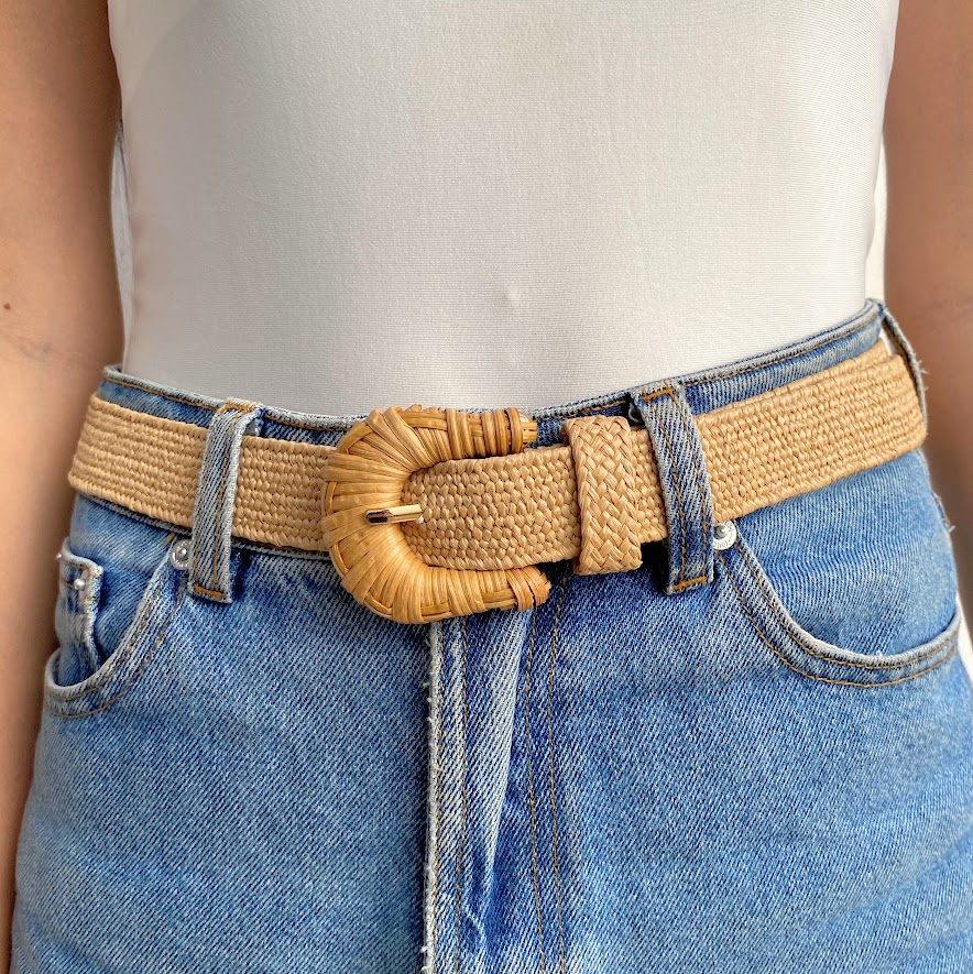 DESCRIÇÃO DO PRODUTO: Cinto trançado em palha clara e elástico com detalhes em corino.
