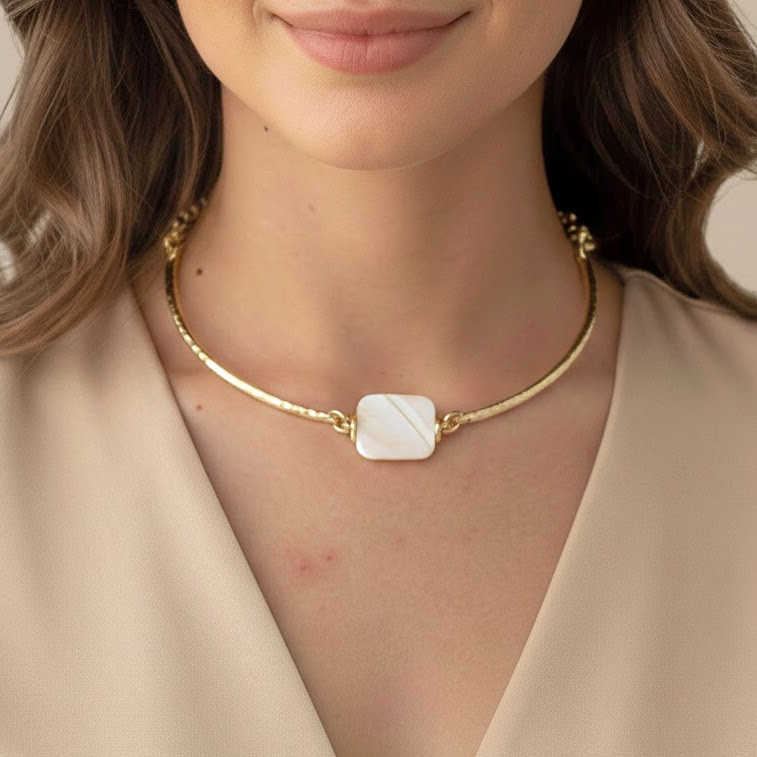 DESCRIÇÃO DO PRODUTO: Colar arco com correntes em alumínio banhado, entremeios curvos resistentes em metal banhado mais detalhe central em madrepérola.