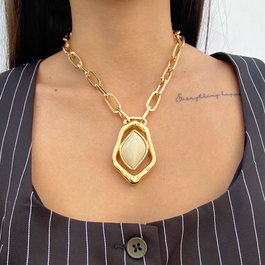 DESCRIÇÃO DO PRODUTO: Colar com correntes em alumínio banhado mais pingente banhado em resina com formato assimétrico