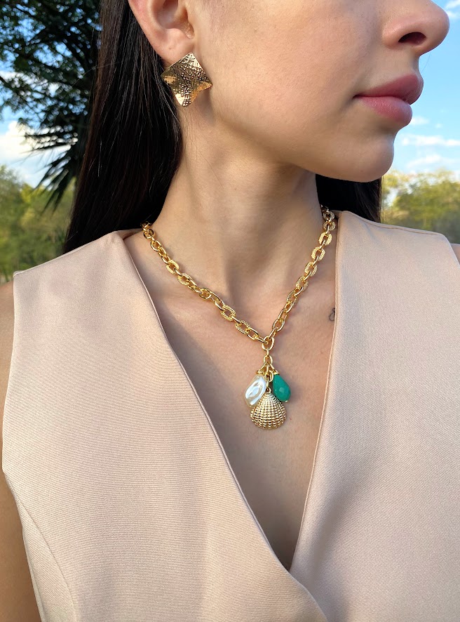 DESCRIÇÃO DO PRODUTO: Colar curto com elos e correntes em alumínio banhado mais pingentes em metal banhado, pérola ABS estilo boho e cristal em vidro no formato gota.