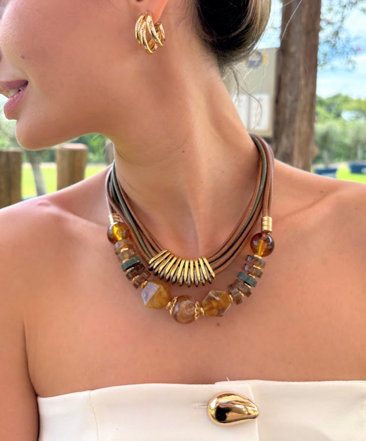 DESCRIÇÃO DO PRODUTO: Colar com fio corda, entremeios em alumínio banhado, detalhes em resina mesclada mais resin com detalhe bombardeado.