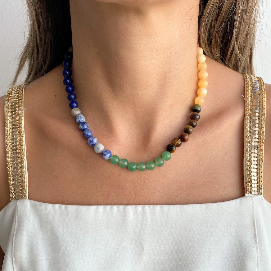 DESCRIÇÃO DO PRODUTO: Colar chakras com entremeios em alumínio banhado mais esferas em pedras naturais.