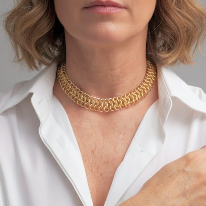 DESCRIÇÃO DO PRODUTO: Colar com corrente entrelaçada em alumínio banhado.