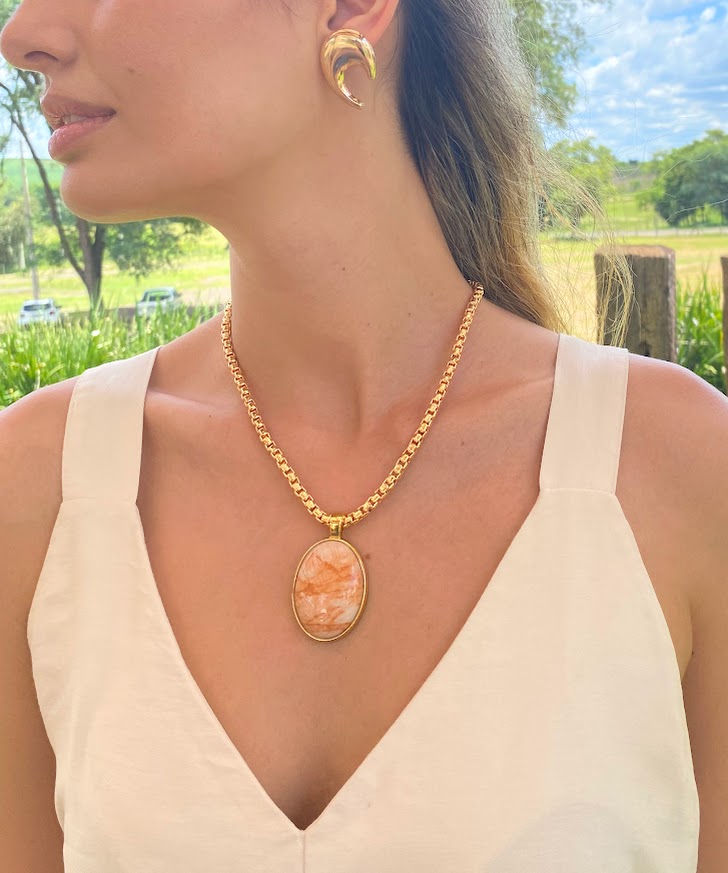 DESCRIÇÃO DO PRODUTO: Colar curto com correntes e entremeios em alumínio banhado com banho em verniz mais pingente em metal cromado no formato oval com resina mesclada.