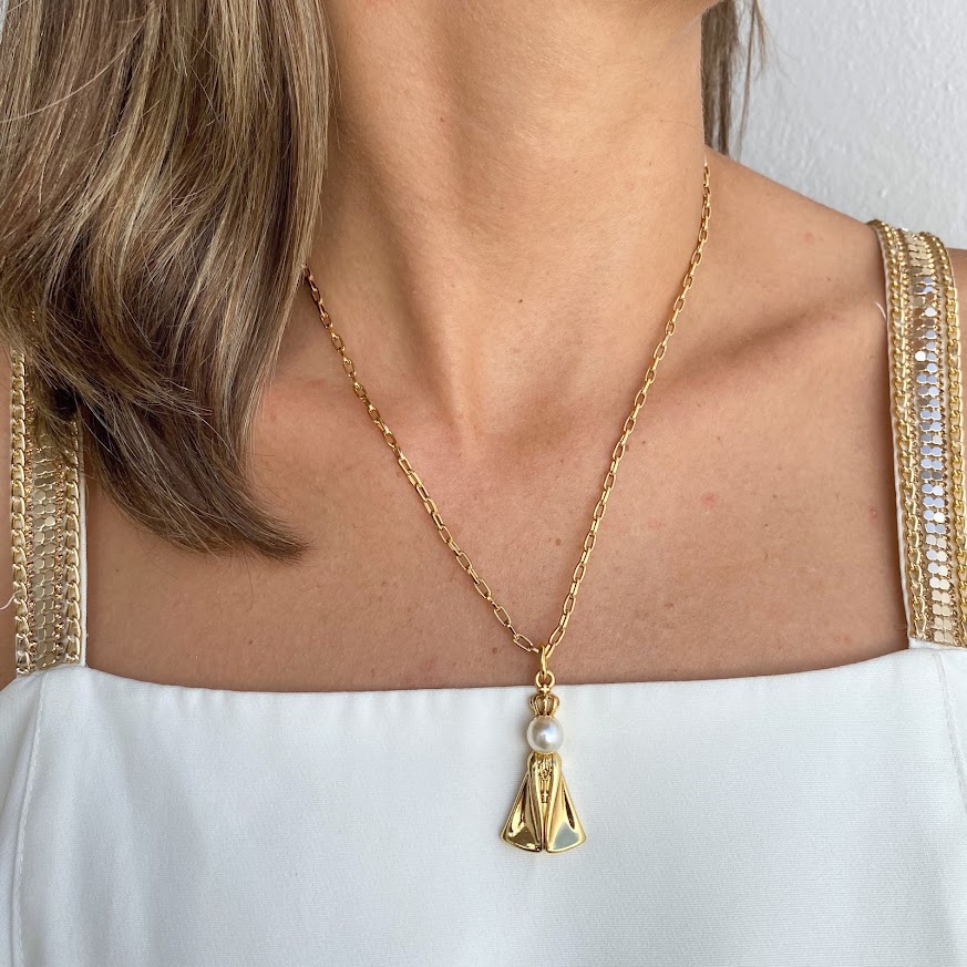 PEÇAS: Colar com correntes e entremeios em alumínio banhado com banho em verniz suíço e Nossa Senhora trabalhada com detalhe em pérola.