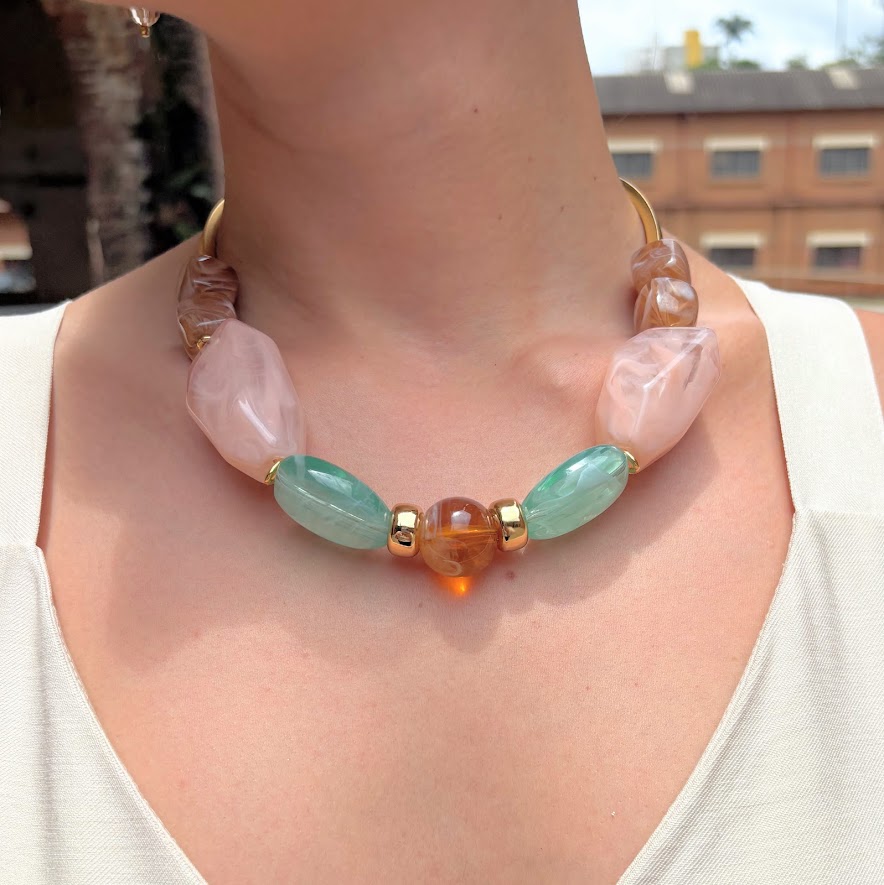 DESCRIÇÃO DO PRODUTO: Colar curto com entremeios e correntes em alumínio banhado mais peças em resina mesclada.