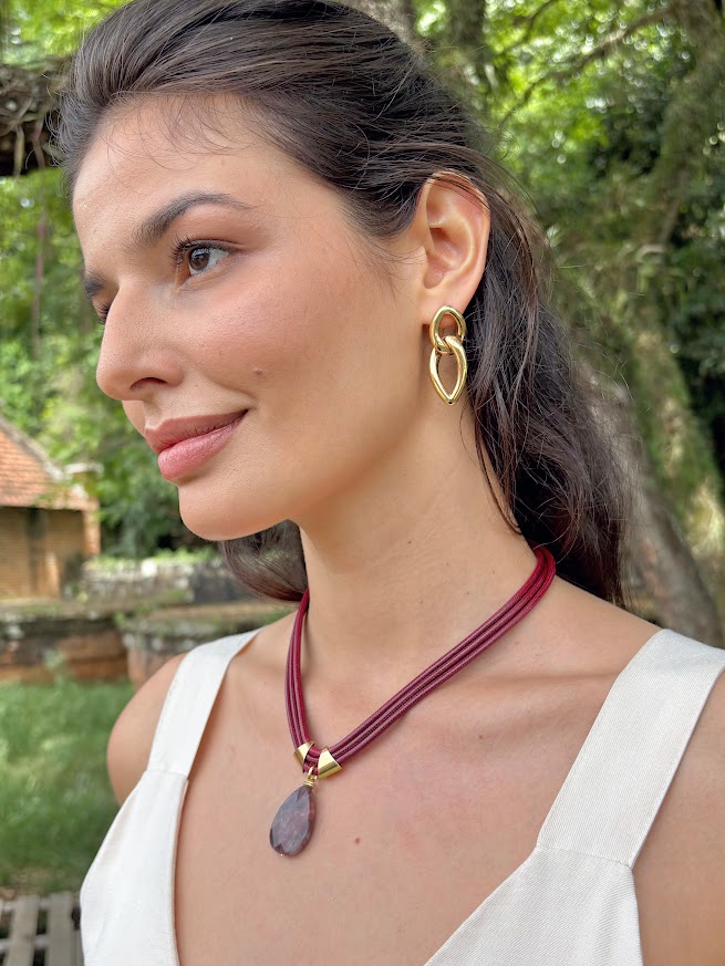 DESCRIÇÃO DO PRODUTO: Colar com fio encerado, entremeios em alumínio banhado mais pingente lapidado em pedra natural, ágata mesclada.