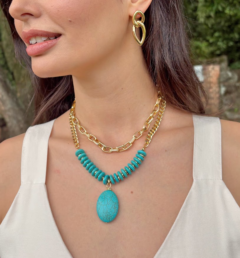 PEÇAS: Colar com correntes e entremeios em alumínio banhado mais banho em verniz suíço. Discos mais pingente oval em pedra natural howlita azul.