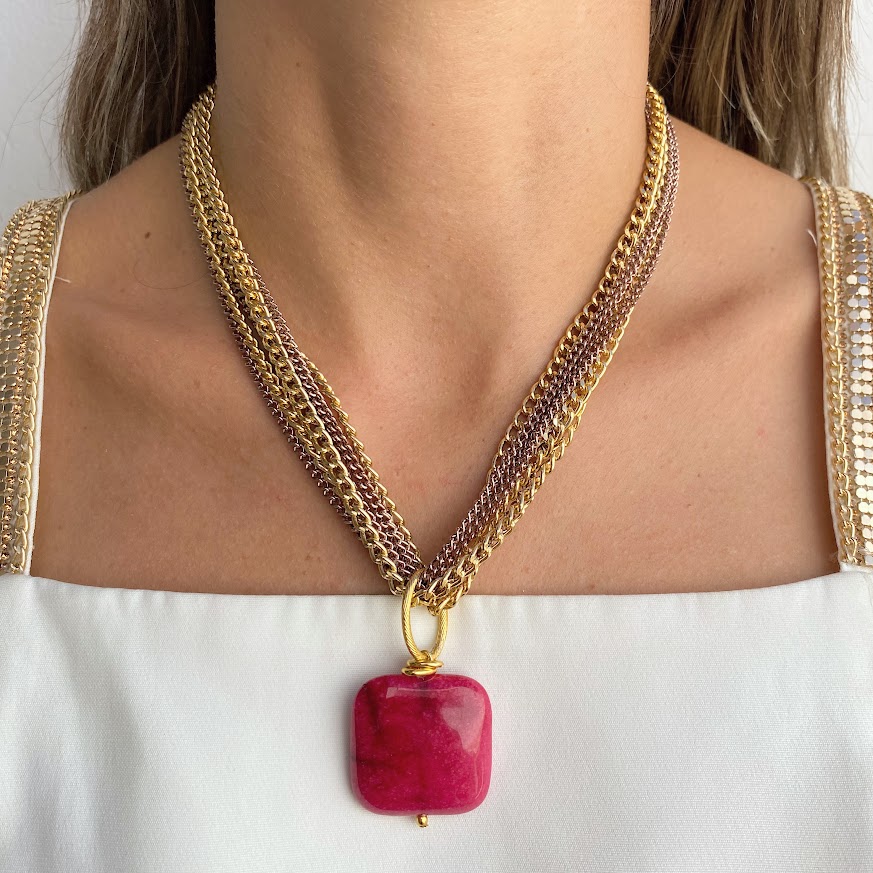 DESCRIÇÃO DO PRODUTO: Colar com correntes e entremeios em alumínio banhado mais pingente quadrado em pedra natural ágata vermelha.