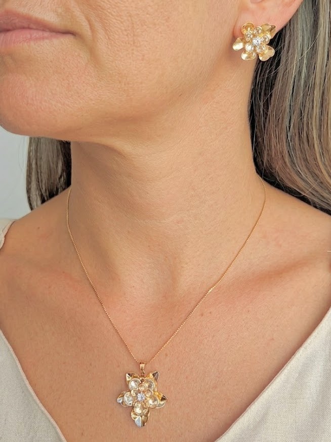 DESCRIÇÃO DO PRODUTO: Conjunto de brinco com colar. Brinco pino mais tarraxa com base no formato de flor em alumínio banhado, pontos de luz em zircônia. Colar com correntes e entremeios em alumínio banhado, pontos de luz em zircônia.