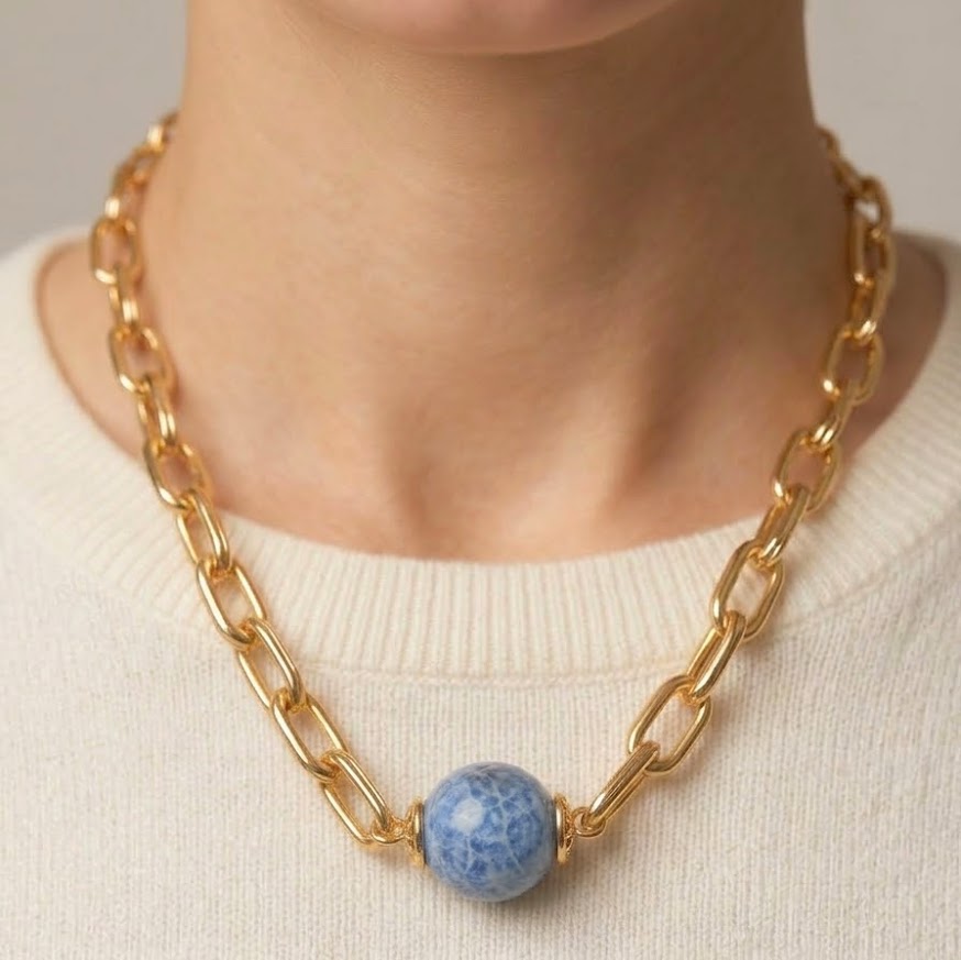 DESCRIÇÃO DO PRODUTO: Colar curto com elos ovais banhados mais esfera central em ágata azul mesclada.