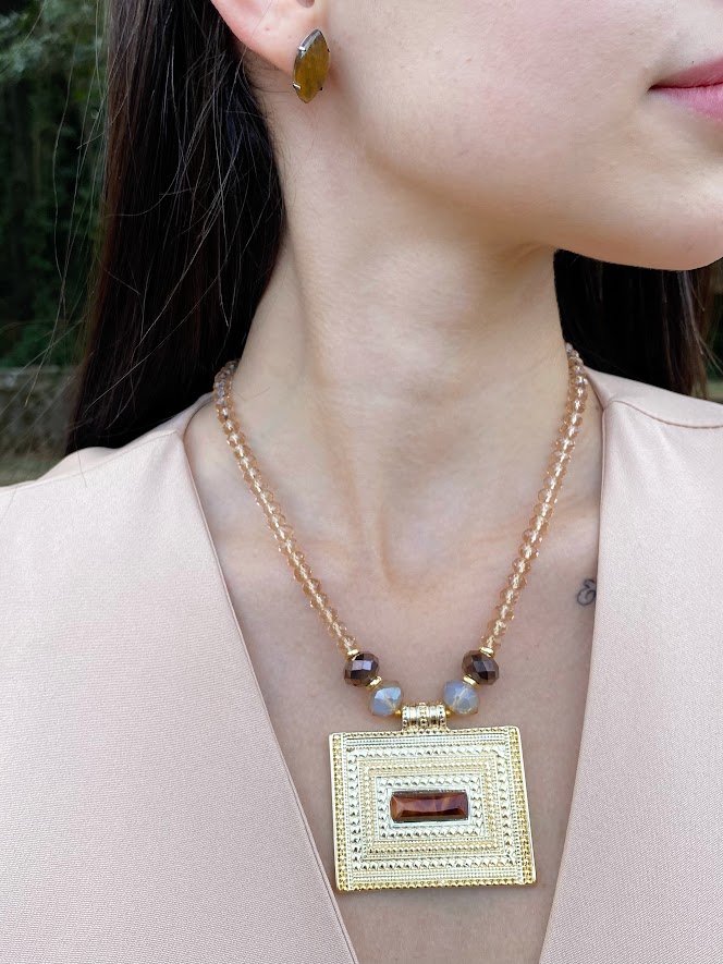 DESCRIÇÃO DO PRODUTO: Colar com correntes e entremeios em alumínio banhado, cristais em vidro mais medalha retangular em metal banhado com detalhe central em resina.