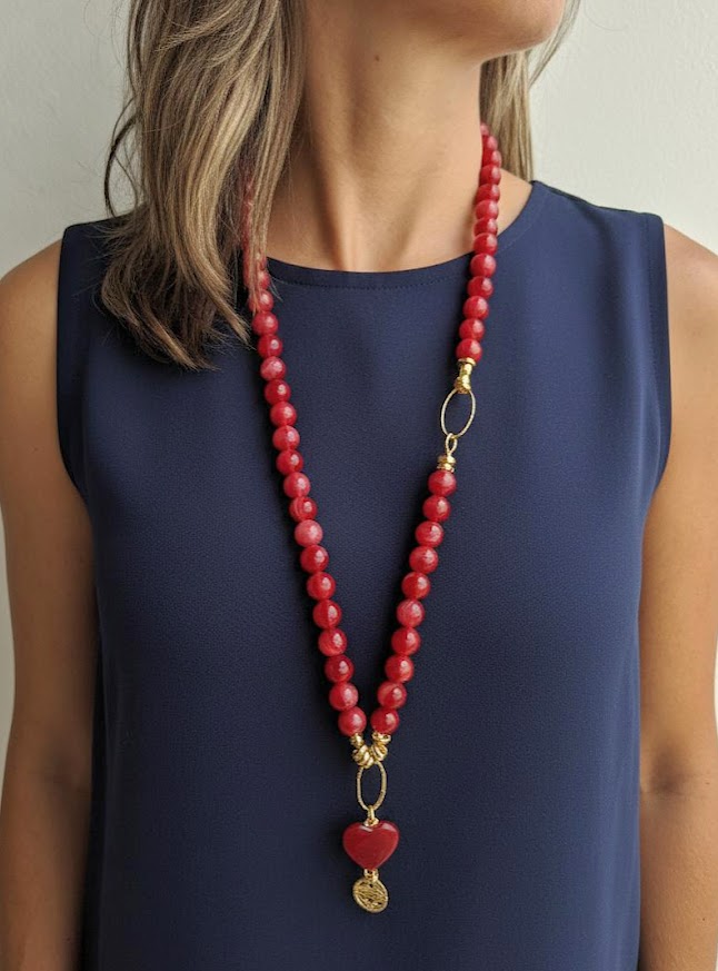 PEÇAS: Correntes e entremeios em alumínio banhado, esferas em resina com nuances mais coração em pedra natural ágata de fogo.