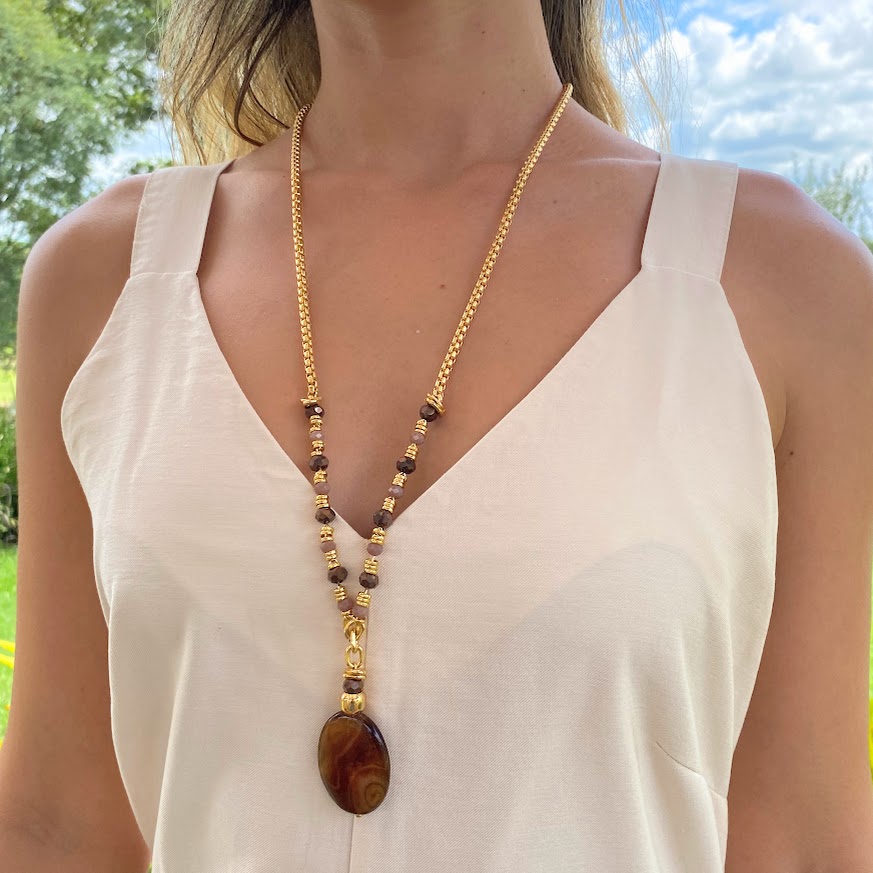 DESCRIÇÃO DO PRODUTO: Colar Longo com correntes e entremeios em alumínio banhado, cristais em vidro mais pedra natural oval em ágata mesclada marrom