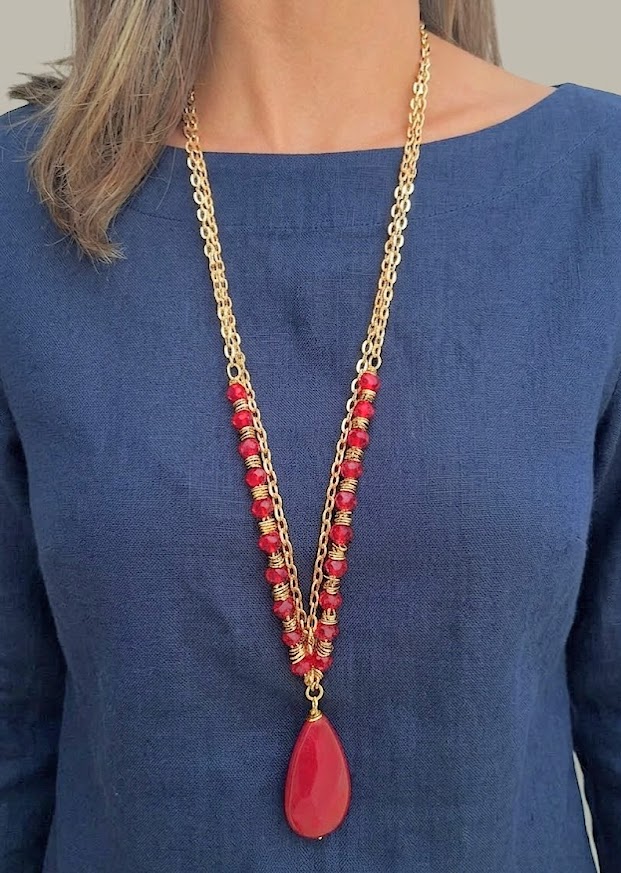 DESCRIÇÃO DO PRODUTO: Colar longo com correntes e entremeios em alumínio banhado mais banho em verniz, cristais em vidro e gota em pedra natural jade rubi.