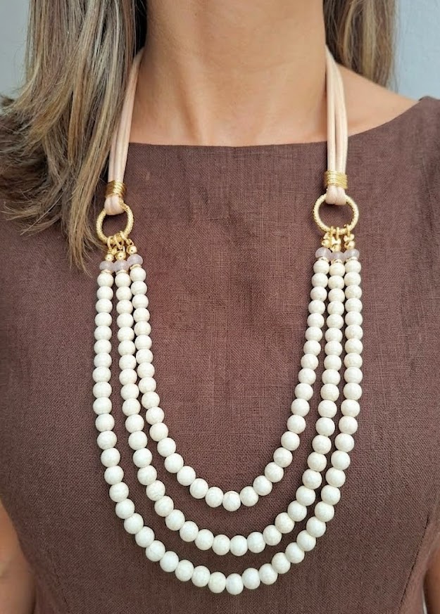 DESCRIÇÃO DO PRODUTO: Colar com fio encerado, entremeios em alumínio banhado, cristais em vidro mais esferas em resina com detalhes marmorizados imitando howlita branca.