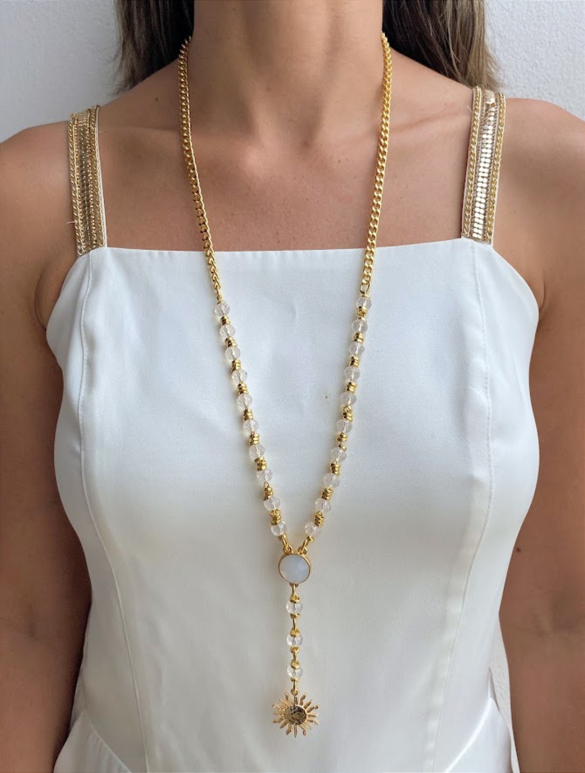 Peças: Entremeios e correntes em alumínio banhado e cristais em vidro.