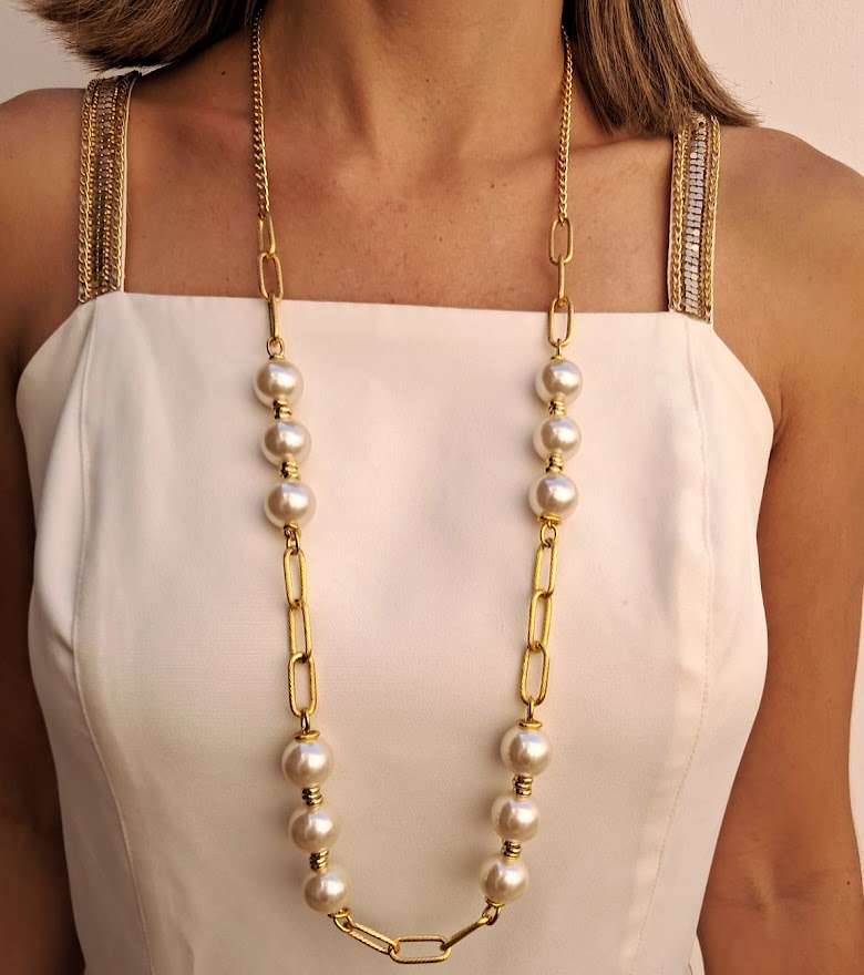 DESCRIÇÃO DO PRODUTO: Colar longo com correntes e entremeios em alumínio banhado mais pérolas em material ABS