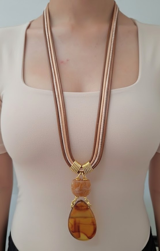 DESCRIÇÃO DO PRODUTO: Colar longo com o fio encerado e fio metalizado, entremeios em alumínio banhado mais pingente gota em resina.