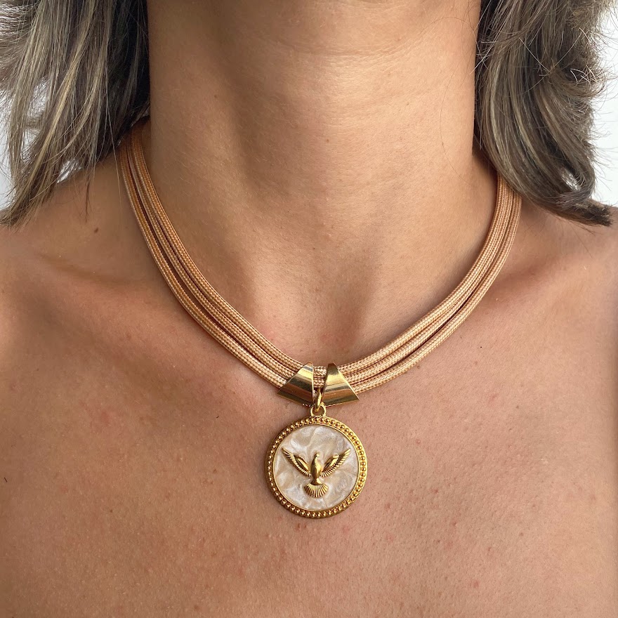 DESCRIÇÃO DO PRODUTO: Colar com fio encerado, entremeios em alumínio banhado mais medalha trabalhada com Espírito Santo e detalhe em resina.