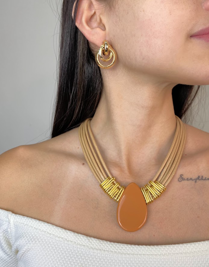 DESCRIÇÃO DO PRODUTO: Colar com fio encerado, entremeios em alumínio banhado mais pingente em resina no formato gota.