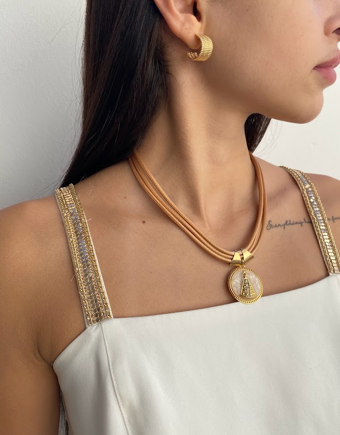 DESCRIÇÃO DO PRODUTO: Colar com fio encerado, entremeios em alumínio banhado mais medalha trabalhada com Nossa Senhora.
