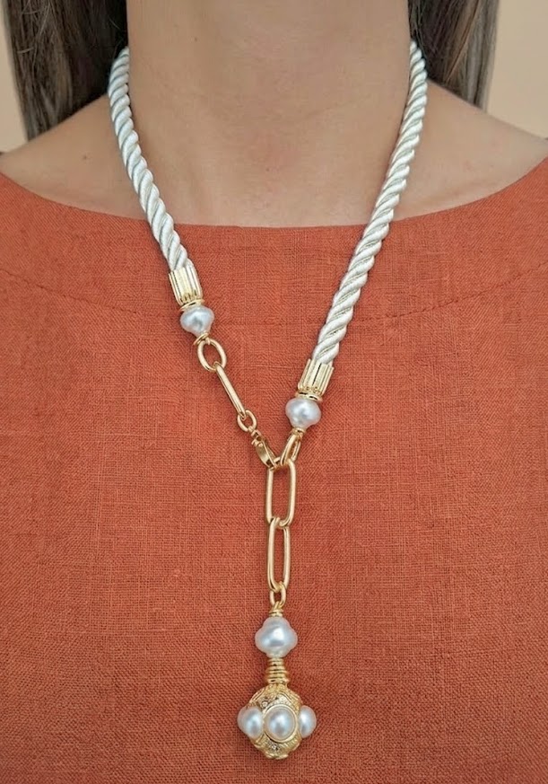 DESCRIÇÃO DO PRODUTO: Colar gravata com fio são francisco, entremeios em alumínio banhado e pérolas em material ABS estilo boho