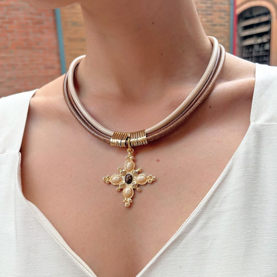 DESCRIÇÃO DO PRODUTO: Colar com fio encerado, entremeios em alumínio banhado mais pingente banhado no formato geométrico com detalhes em resina.