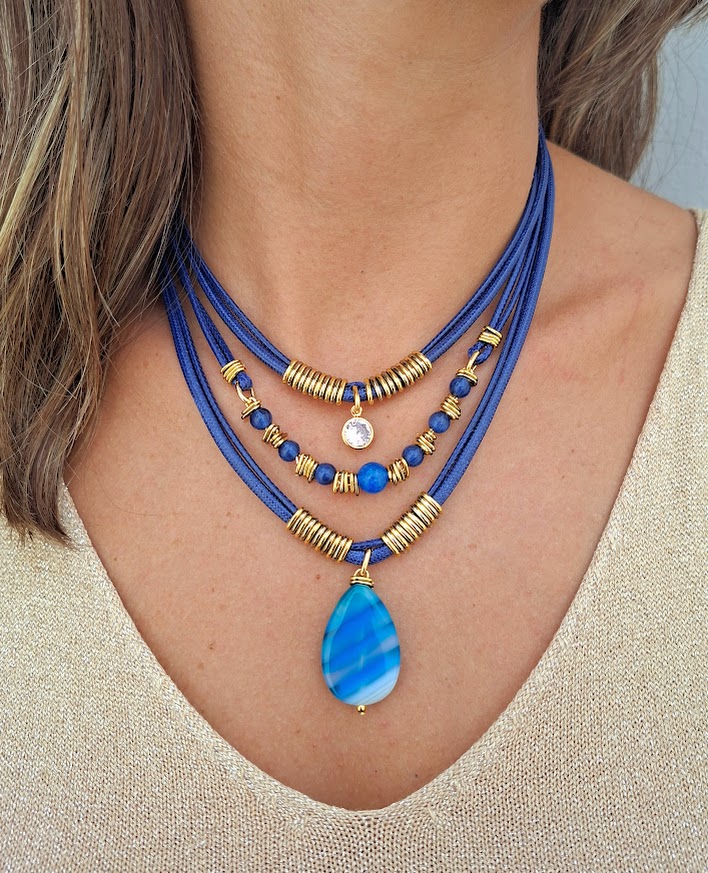 DESCRIÇÃO DO PRODUTO: Colar com fio encerado, entremeios em alumínio banhado, esferas em olho de gato, jade azul e pingente em ágata azul no formato gota. Ponto de luz em zircônia.