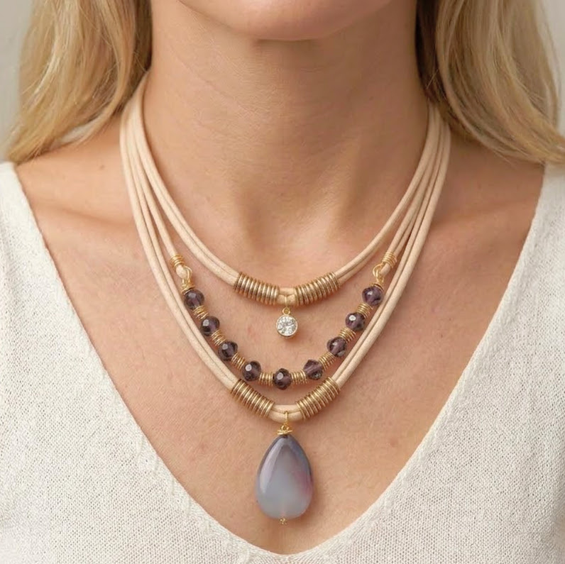 DESCRIÇÃO DO PRODUTO: Colar com fio encerado, entremeios em alumínio banhado, cristais em vidro mais pingente no formato gota em pedra natural de ametista. Ponto de luz em zircônia.