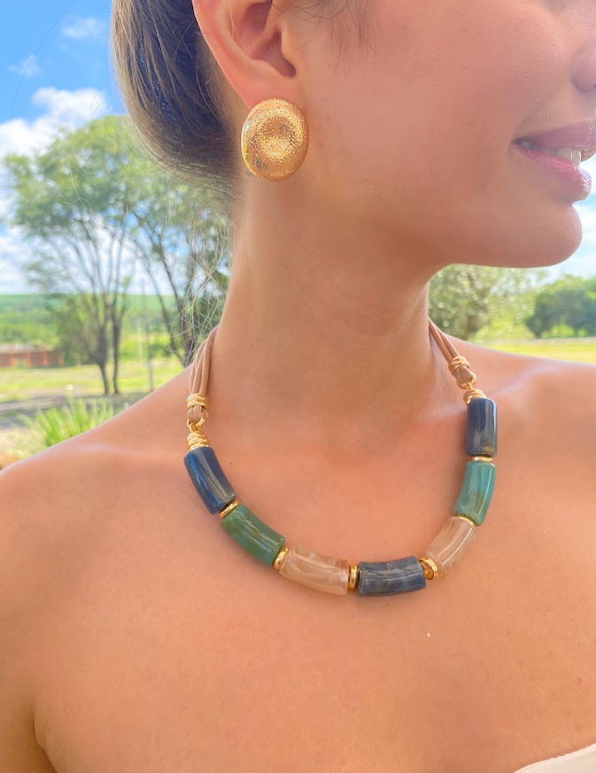 DESCRIÇÃO DO PRODUTO: Colar curto com fio encerado, entremeios e correntes em alumínio banhado e tubos mesclados em resina.