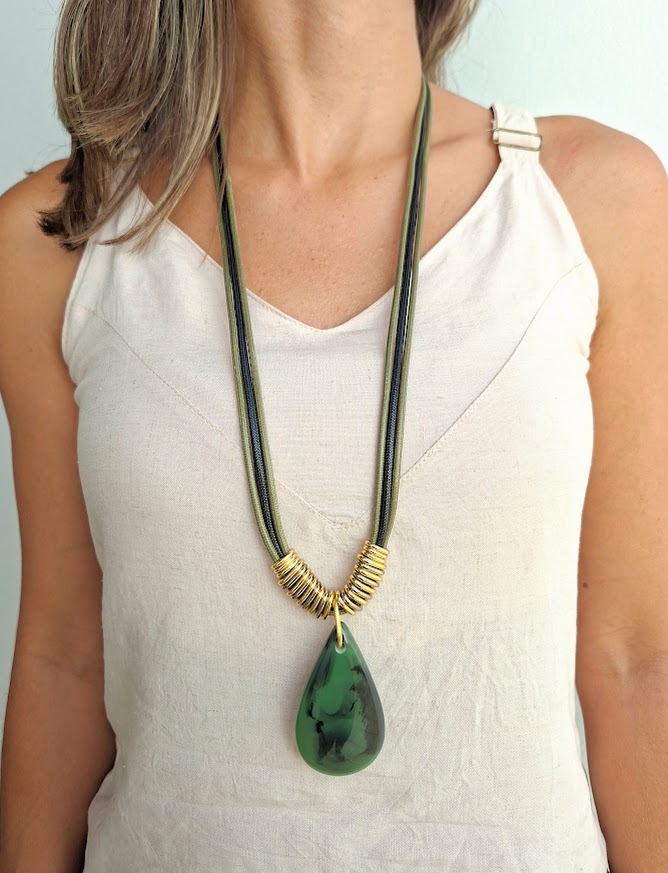 DESCRIÇÃO DO PRODUTO: Colar longo com fio encerado, entremeios em alumínio banhado mais pingente gota em resina.