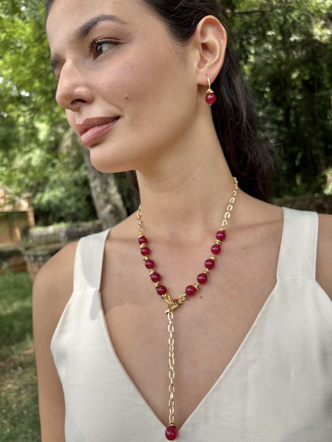 PEÇAS: Colar com correntes e entremeios em alumínio banhado mais esferas em jade rubi. Brinco gancho com base em metal banhado e pontos de luz em zircônia, esfera em jade rubi.